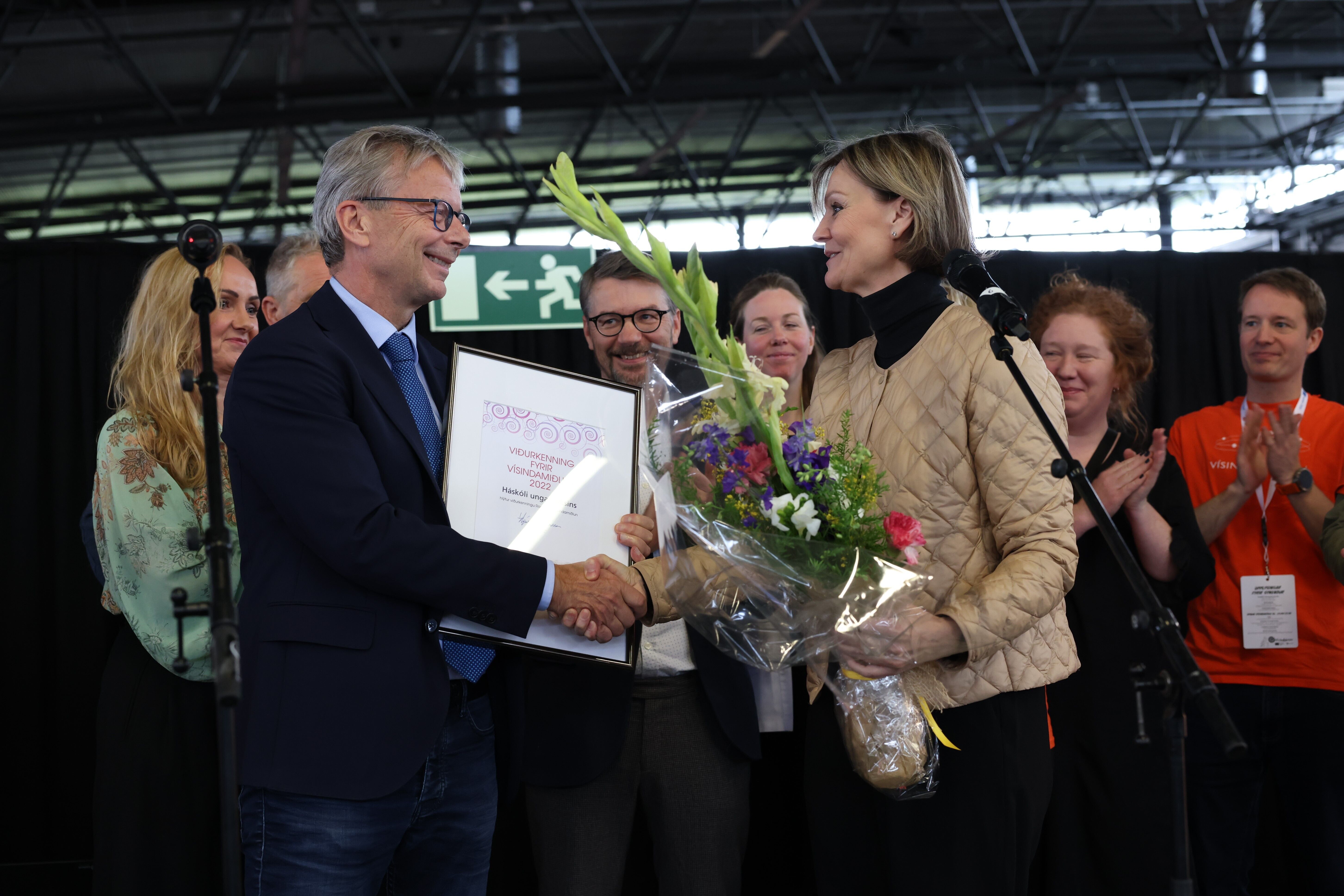 Meðfylgjandi mynd er frá verðlaunaafhendingu árið 2022 en það ár var viðurkenningin veitt Háskóla unga fólksins. Á myndinni má sjá Jón Atla Benediktsson, rektor Háskóla Íslands, taka við viðurkenningarskjali og blómvendi, fyrir hönd Háskóla unga fólksins, frá Ásdísi Höllu Bragadóttur, ráðuneytisstjóra háskóla-, iðnaðar- og nýsköpunarráðuneytisins.