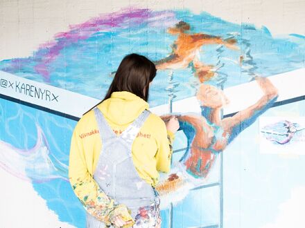 Meðan á gleðinni stóð mundaði vegglistakonan xKarenÝrx pensilinn einbeitt á svip, en hún málaði fallega mynd í tilefni veislunnar sem fær áfram að prýða einn vegg Laugardalslaugarinnar.