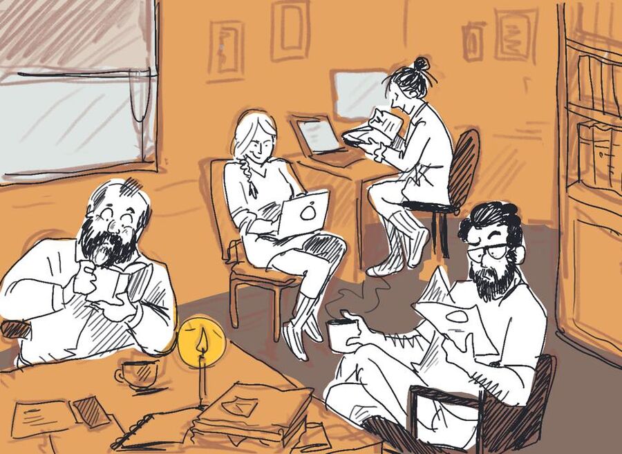 Á myndinni, sem teiknuð er af Sunnevu Guðrúnu Þórðardóttumá sjá starfsmenn Þjóðfræðistofu að störfum.