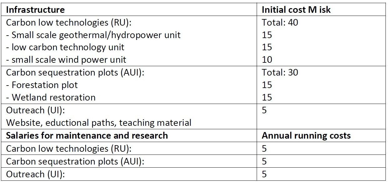 The Agricultural University of Iceland (AUI), University of Iceland (UI) and Reykjavik University (RU) propose to create a carbon-neutral university campus as a demonstration case of a carbon-neutral society for policymakers, concerned citizens, visitors, researchers, and students. The project involves the implementation of carbon low and carbon-neutral technologies (renewable energies, carbon low transportation) and carbon sequestration projects (forestation and wetland restoration) to ensure carbon neutrality. For this purpose, AUI, UI and RU propose to develop a research, innovation and teaching campus where the above mentioned measures can be implemented and used for research and teaching purposes. For instance, the campus should be energetically self-sufficient, by using renewable energies, such as a small scale hydropower or geothermal energy sources, or small wind power, as well as the potential for C sequestration through forestation and wetland restoration. Further activities, including circular economy, green-blue technologies, waste recovery, and water treatment will be implemented as the project proceeds. All subprojects should be accessible to scientists for research purposes, for students for teaching purposes and to the general public for outreach purposes.