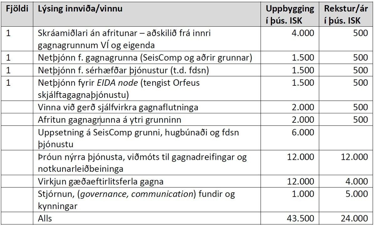 The investment cost for this equipment is roughly 800,000 Euros. Annual operational costs are estimated to be roughly 20,000,000 ISK and include calibration, salaries and rent.