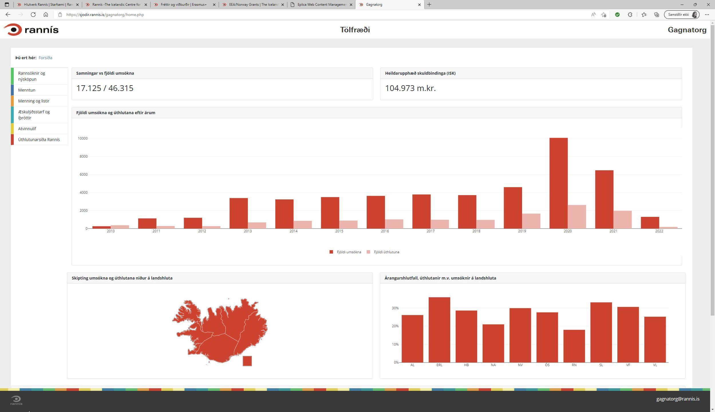 Á Gagnatorgi Rannís má finna ítarlegar upplýsingar um fjölda umsókna og úthlutanir einstakra sjóða, ár úthlutunar, umsækjendur og stuðningsupphæðir. Einnig verður hægt að fletta upp nánari upplýsingum um einstök verkefni í hnotskurn, þar sem nánari upplýsingar eru tiltækar.