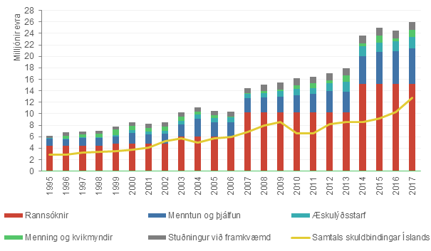 Þátttaka Íslands í samstarfsáætlunum ESB hefur verið umfangsmikil frá 1995. Árangur af sókn íslenskra aðila í evrópskar samkeppnisáætlanir hefur verið góður í samanburði við aðrar Evrópuþjóðir og fjárhagslegt umfang þátttökunnar hefur aukist í takt við stækkandi áætlanir á hverju tímabili. Fjárhagslegur ávinningur Íslands af þátttökunni er mun meiri en það sem lagt er til áætlunarinnar; fyrir hverja evru sem lögð er til koma rúmlega tvær evrur til baka, eins og mynd 1 sýnir. Á sömu mynd má sjá heildarstuðning til Íslands frá árinu 1995 til ársins 2017, annars vegar styrkveitingar til Íslands og hins vegar skuldbindingar Íslands vegna þátttöku. Af þeim þremur áætlunum sem Rannís hefur umsjón með er Horizon 2020 stærst, en hún er um 76% af umfangi þess samstarfs sem Ísland tekur þátt í á grundvelli EES samningsins. Erasmus+ er um 15% af umfangi og Creative Europe er um 1,5%. Þessar þrjár áætlanir eru stærri á yfirstandandi tímabili en fyrri áætlanir og er heildarfjárveiting ESB til þeirra á tímabilinu 2014–2020 um 100 milljarðar evra.