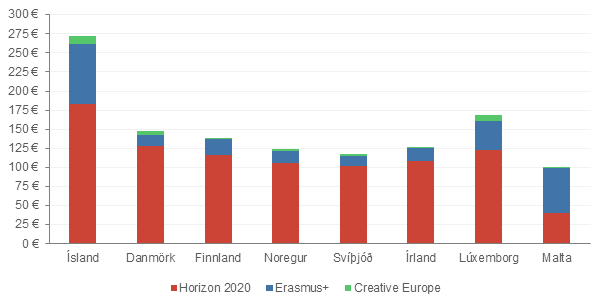 Ein leið til að meta árangur er samanburður við aðrar þjóðir. Mynd 2 sýnir styrki í evrum á hvern íbúa í þeim samanburðarlöndum sem valin hafa verið í þessa tölfræðisamantekt. Myndin sýnir að styrkveitingar á hvern íbúa eru hæstar á Íslandi og munar þar umtalsverðu. Af myndinni má álykta að árangur af sókn í áætlanirnar hafi verið góður. Rétt er að taka fram að í Erasmus+ er ekki samkeppni á milli landa, úthlutun styrkja fer að mestu leyti fram í löndunum sjálfum og byggist hún á ákveðnum reiknireglum. Njóta þar smærri ríkin fámennisins eins og myndin sýnir glöggt.