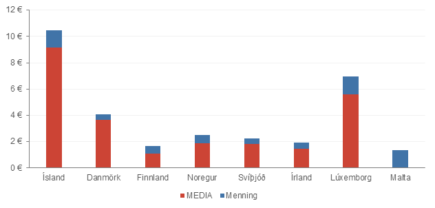 Mynd 11 sýnir hversu háa styrki íslenskir aðilar fá á hvern íbúa til samanburðar við Norðurlöndin, Írland, Lúxemborg og Möltu. Íslendingar fengu rúmlega tíu evrur á hvern íbúa í styrki frá Creative Europe tímabilið 2014–2017, sem er hærri upphæð miðað við samanburðarlöndin.