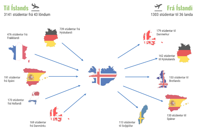 Samstarfsnet íslensku háskólanna sjö er umfangsmikið – en þeir hafa átt í samstarfi við meira en 550 háskóla í 30 löndum á þessu tímabili. Á mynd 10 má sjá frá hvaða löndum Erasmus+ háskólastúdentar koma helst og til hvaða landa þeir fara helst.