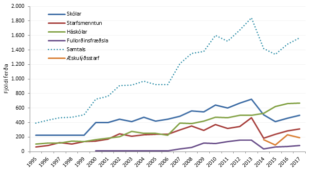 Mynd 7. Menntun: Fjöldi styrkþega (einstaklinga) frá Íslandi 1995–2017.*