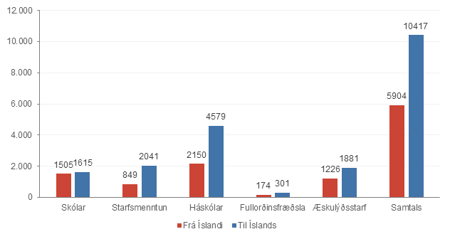 Í upphafi þátttöku Íslands í menntasamstarfinu voru fleiri sem fóru frá Íslandi til Evrópu en sem komu til landsins; í kringum aldamótin snerist þetta við og fleiri fóru að koma en fara utan. Á tímabilinu 2014–2017 hafa fleiri komið til Íslands en farið frá Íslandi í öllum tegundum ferða eins og mynd 9 ber með sér. Munurinn er mestur í starfsmenntun, á háskólastigi og í fullorðinsfræðslu þar sem ríflega tvöfalt fleiri koma en fara.
