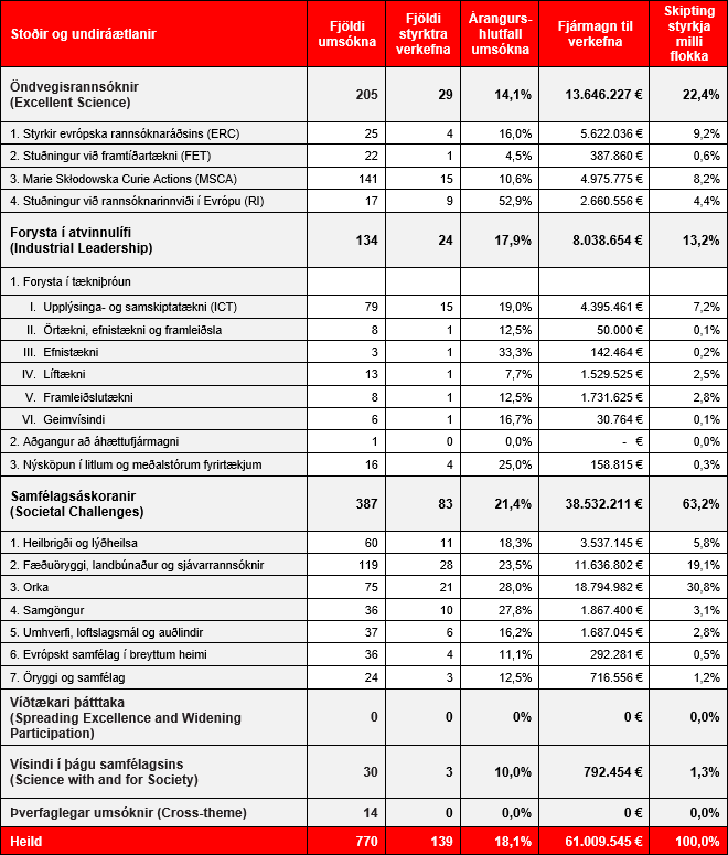 Almennt hafa íslenskir aðilar verið virkir í Horizon 2020, dreifing umsókna er nokkuð góð en ljóst má vera að bæði virkni og árangur er breytilegur eftir sviðum (sjá töflu 1). Í Samfélagsáskorunum hafa sóknarþungi og árangur íslenskra aðila farið saman og þá sérstaklega í undiráætlununum Fæðuöryggi, landbúnaður og sjávarrannsóknir (Food Security, Sustainable Agriculture and Forestry, Marine, Maritime and Inland Water Research and the Bioeconomy), Heilbrigði og lýðheilsa (Health, Demographic Change and Wellbeing) og Orkuáætlun (Secure, Clean and Efficient Energy). Virkni Íslendinga hefur einnig verið töluverð í Öndvegisrannsóknum og Forystu í atvinnulífi en þar hefur ásókn verið mest í undiráætlanirnar Upplýsinga- og samskiptatækni (Information and Communication Technologies) og mannauðsáætlunina Marie Skłodowska Curie Actions (MSCA), þar hefur árangurshlutfall hins vegar verið lægra enda samkeppni mikil. Heilt yfir má segja að Íslendingar fari vel af stað í Horizon 2020 áætluninni og séu virkir í flestum hlutum hennar. Í samanburði við fyrri rannsóknaáætlanir ESB vekur þó athygli að töluverð aukning hefur verið á virkni og árangri Íslendinga í Orkuáætluninni og Samgönguáætluninni (Smart, Green and Integrated Transport). Ásókn í Heilbrigðis- og lýðheilsuáætlunina er enn góð en árangurshlutfall hefur dregist saman frá því sem áður var.