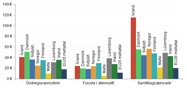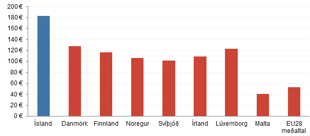 Ef heildarárangur Íslendinga er skoðaður út frá því hve margar evrur renna til hvers íbúa, sjá mynd 3, kemur í ljós að það fjármagn sem borist hefur hingað til lands nemur um 182,5 evrum á hvern Íslending (m.v. fólksfjölda árið 2016). Árangur Íslands er því töluvert betri en þeirra samanburðarlanda sem litið er til; á eftir Íslandi kemur Danmörk með 127,6 evrur á hvern íbúa og Lúxemborg með 123,2 evrur á hvern íbúa. Meðaltal ESB er svo umtalsvert lægra eða 52,9 evrur á hvern íbúa.